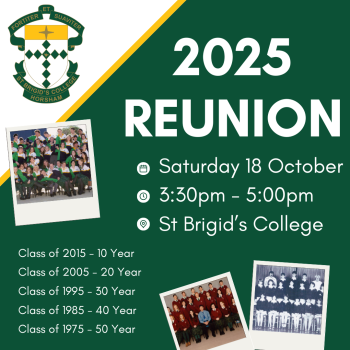 We are excited to invite alumni from the Classes of 2015, 2005, 1995, 1985 and 1975 to join us for their Milestone Reunion on Saturday 18 October, 2025, at 3:30pm. The event will be held at St Brigid's College.